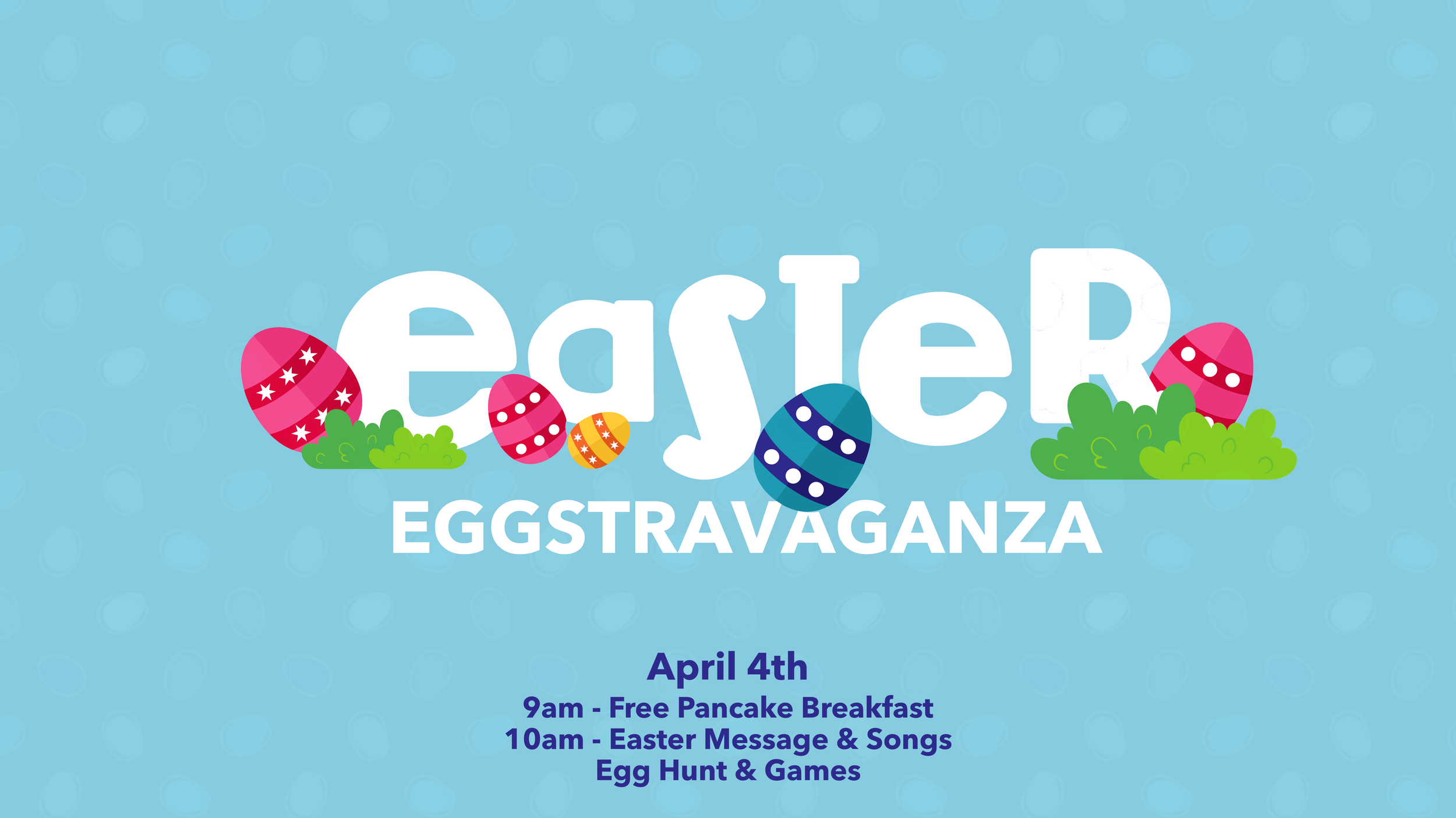 Starting at 9am, you can join us for a FREE breakfast. We’ll be serving pancakes, eggs, and sausage. With hot coffee, and tea as well. Just come on in to the gym anytime before 10am to grab some food. At 10am, we’ll move over to the Worship Center for an Easter Message, some fun songs to sing (and dance!). Following this, we’ll give you some instructions on the Egg Hunt, and then release to go hunt for eggs. We’ll have some games for the kids to play and face painting as well. We hope to see you there!